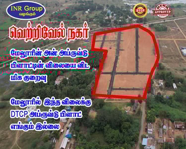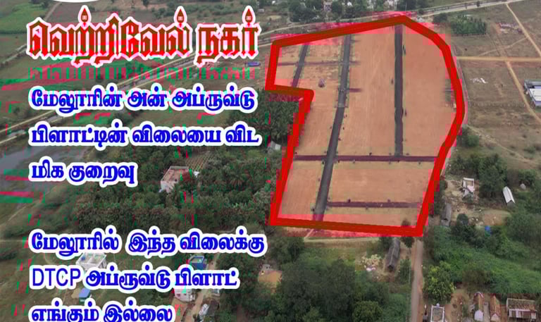 Vetrivel Nagar offers spacious plots embraced by natural surroundings, perfect for building your dream home away from city bustle. Just 10 minutes from Melur Bus Stand
